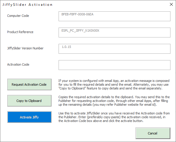 To continue with uninterrupted use of JiffySlider beyond the trial period, you need to activate the Product. Beyond the trial period, JiffySlider is configured to work with an activation code that is specifically generated for the system on which it is installed.