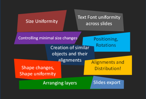 The functions are carefully crafted by identifying the “time-wasters” that typically cause the non-content time to blow up and cause productivity issues. The accelerators, while allowing users to finish the editing related, arrangement and presentation related works faster, will let users’ time be well used for the content rather than the mundane look and feel and placement related jobs.